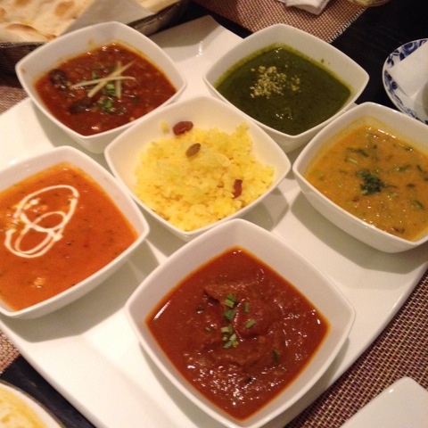 それから魚、ほうれん草、豆、羊、チキンのカレー(写真:おかわり自由)。