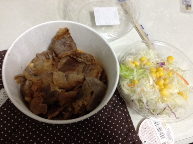 夕食:松屋の牛カルビダブル肉と野菜サラダ