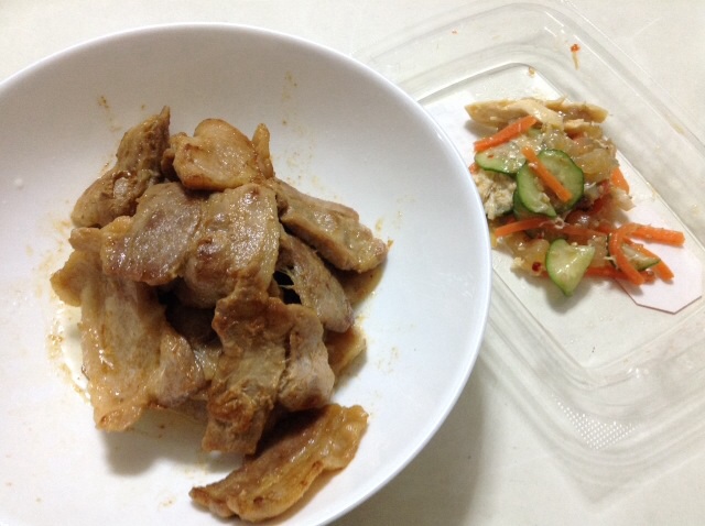 夕食:バラ肉焼き、鶏肉とくらげの和え物