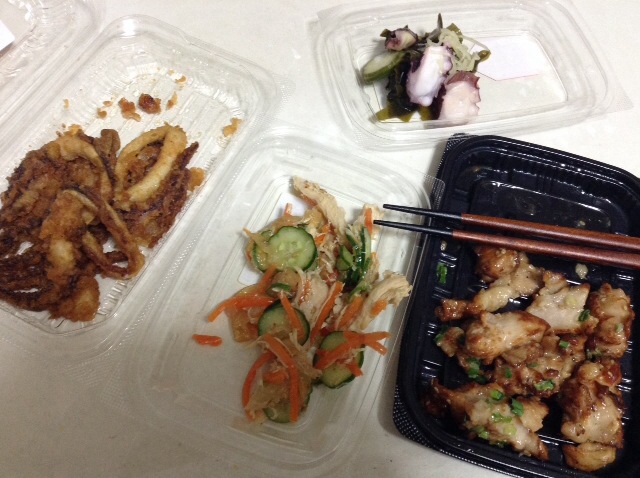 夕食:西友のお惣菜ズ(ネギ塩チキン、タコとワカメの酢の物、蒸し鶏とくらげの和え物、イカの唐揚げ)