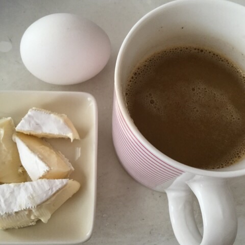 朝食:ゆでたまご、ブリーチーズ、バター入りコーヒー