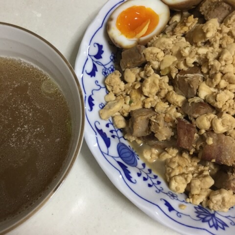東海林風チャーシュー&半熟たまごを漬けた醤油で豆腐チャーハン。