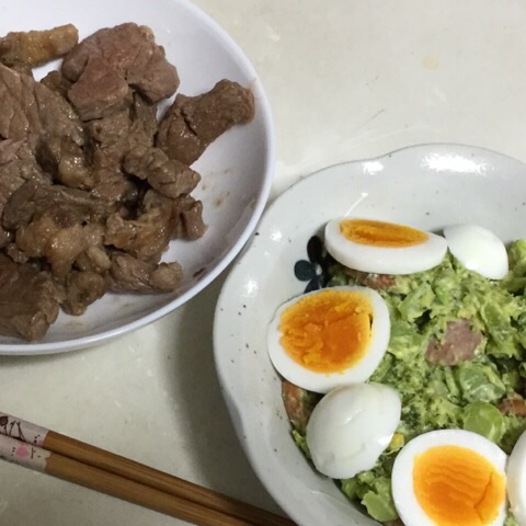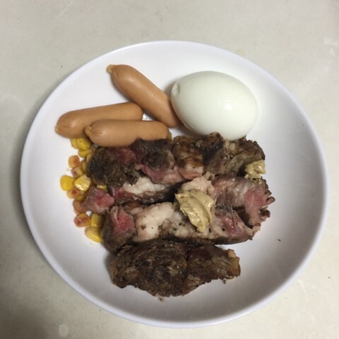 夕食:ステーキ、ゆでたまご、チーズinソーセージ
