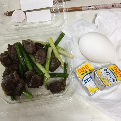朝食:砂肝炒め、チーズ、ゆでたまご