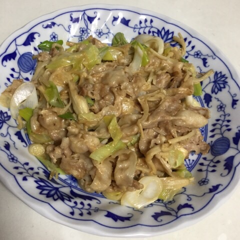 朝食:豚バラとネギときのこのオイマヨ炒め