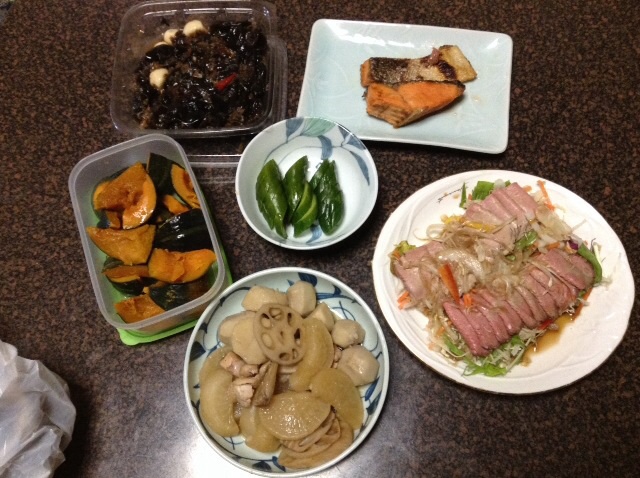キュウリの糠漬け、ローストビーフ、大根の煮物)
