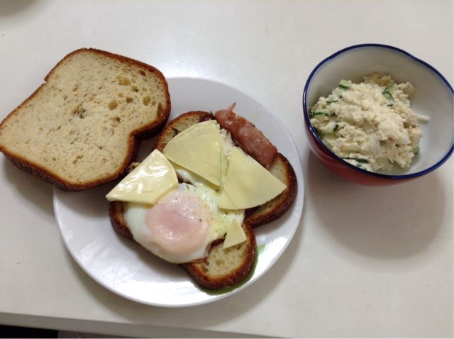 朝食:ゴマヨグ食パンのサンドイッチ(ベーコンエッグ+チーズ) 糖質7gくらい