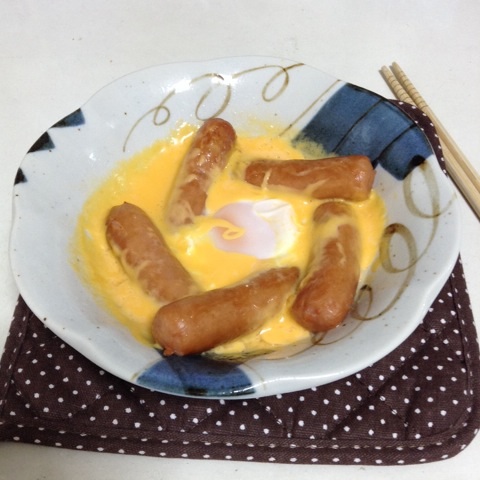 朝食:ウインナーの巣篭もりたまご チーズのっけ 糖質6gくらい