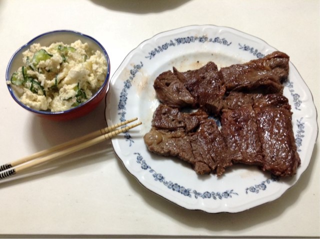 夕食:おからサラダ&ビフテキ(クレイジーソルト) 糖質6gくらい
