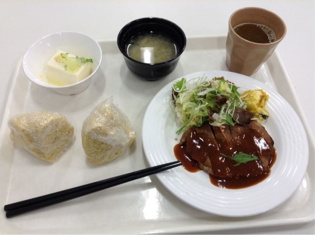 昼食:社食(トンテキ定食・白飯抜き)+オート麦ファイバーの蒸しパン。 糖質たぶん26gくらい。