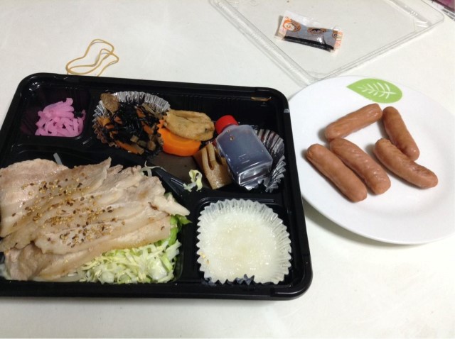 夕食:豚網焼き弁当(煮物全部残し)&ウインナー 糖質量不明(20gも無いはず)