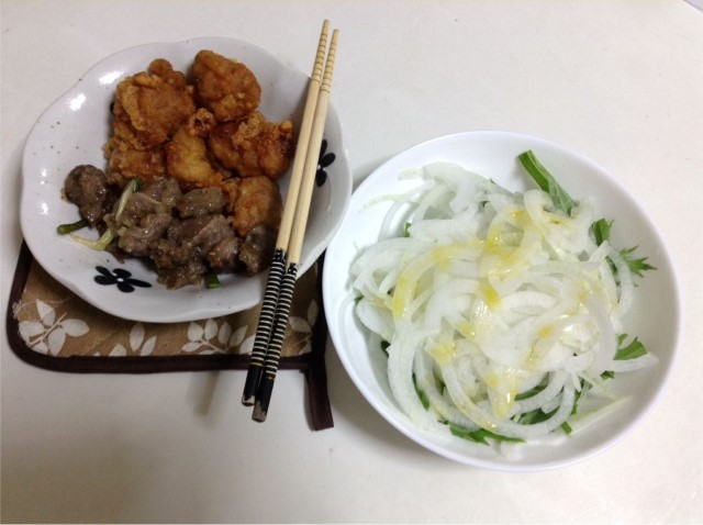 夕食:鶏の唐揚げ&砂肝(塩)&水菜と新玉ねぎのサラダ 糖質19gくらい
