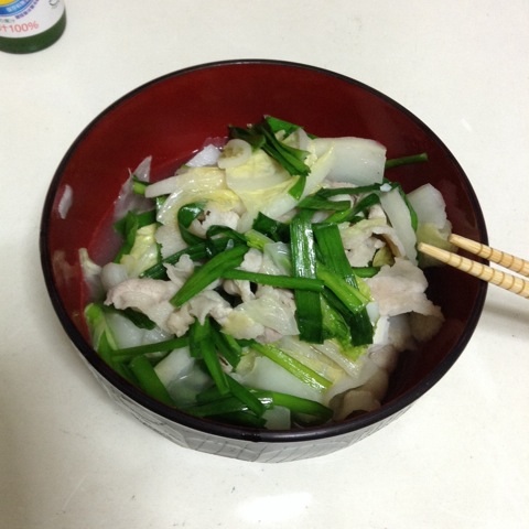 夕食: 豚バラ肉とキャベツのニンニク鍋-キャベツ+白菜+ニラ 糖質10gくらい