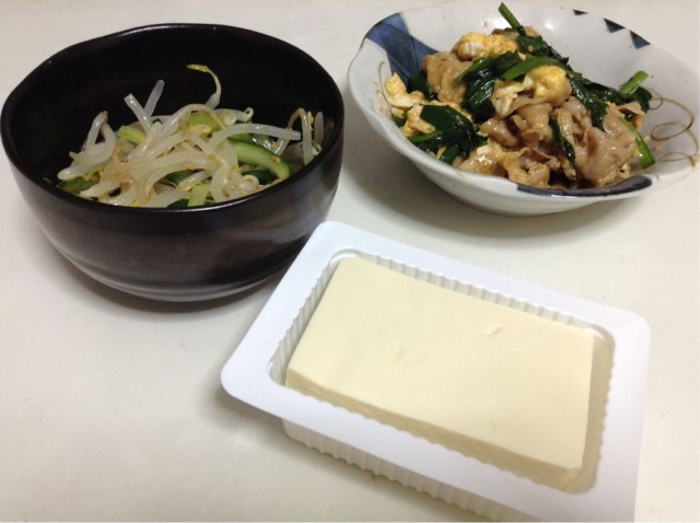 夕食:ニラと豚バラとたまごのオイマヨ炒め+もやしときゅうりのナムル+絹ごし豆腐(賞味期限ギリw) 糖質7gくらい