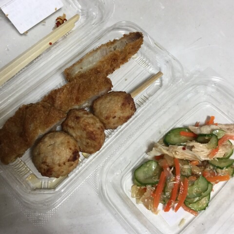 夕食:トンカツ、つくね串、蒸し鶏とくらげのサラダ