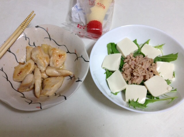夕食:鶏むねの塩だれ炒め&水菜と豆腐とツナのサラダ 糖質3gくらい