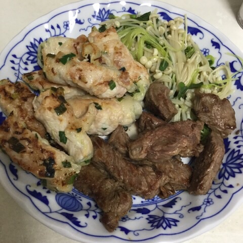夕食:ステーキ、肉巻き餃子、えのきとかいわれのソテー