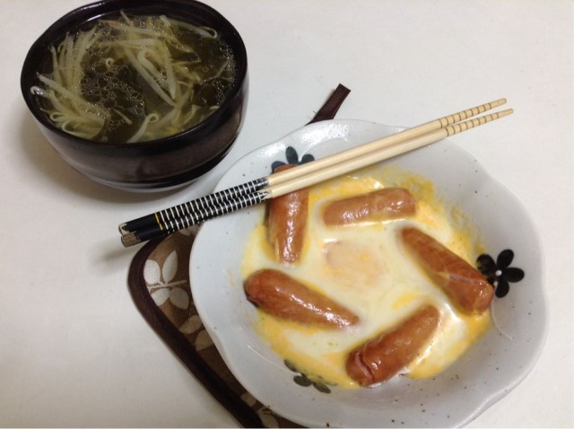 朝食:ウインナーの巣篭もりたまご+チーズ&昨夜のスープ 糖質6gくらい
