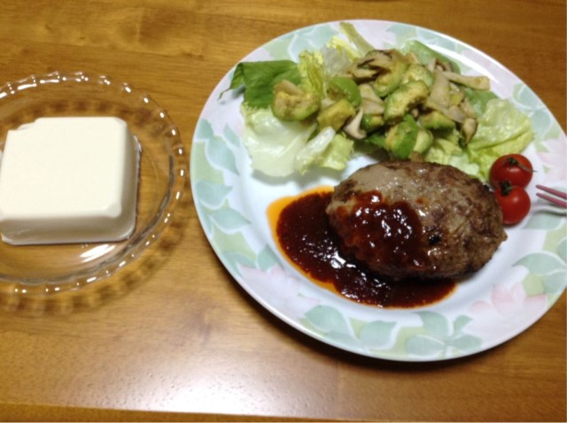 夕食:豆腐&ハンバーグ&アボカドとエリンギのニンニク醤油炒め 糖質不明 多分20g超(;^_^A