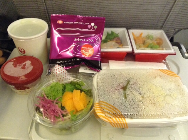 昼食:機内食(JAL) 白飯と焼きそばのあんかけ丼&グリーンサラダ&ポテトサラダ&切り干し大根&ハーゲンダッツ&あられ