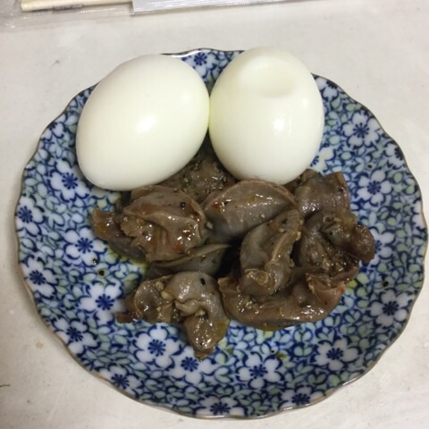 朝食:ゆで卵、砂肝、チーズ