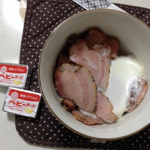 夕食:ベーコン120g&卵1個&ベビーチーズ2個…あと米焼酎の水割w