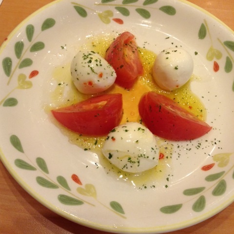 昼食:サイゼリヤで辛味チキン、モッツアレラとトマトのサラダ