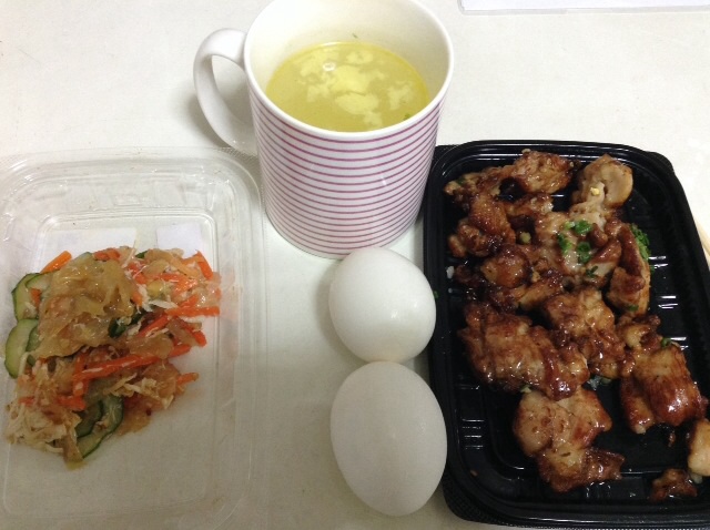 夕食:ネギ塩チキン、ゆでたまご、鶏とくらげの和え物、具なし鶏がらスープinバター