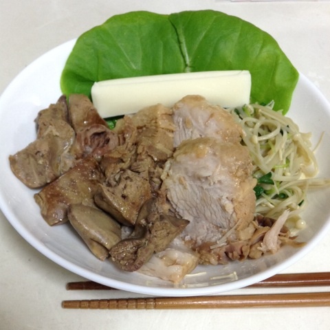 夕食:チャーシュー、ゆで鶏レバー、えのき、かいわれ、サラダ菜、チーズ