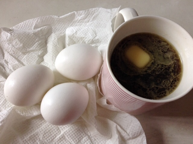 朝食:ゆでたまご、コーヒー+バター