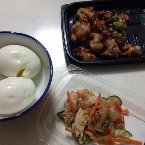 夕食:西友のお惣菜(ネギ塩チキン、蒸し鶏とくらげの和え物半量ずつ)、ゆでたまご