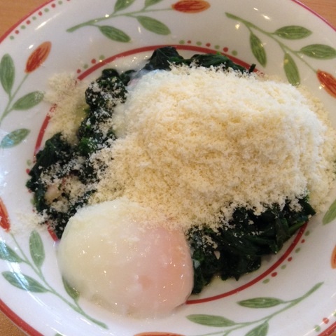 昼食:サイゼリヤでほうれん草のソテー+温玉2個+粉チーズ