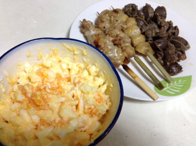 夕食:焼き鳥、砂肝、たまごサラダ