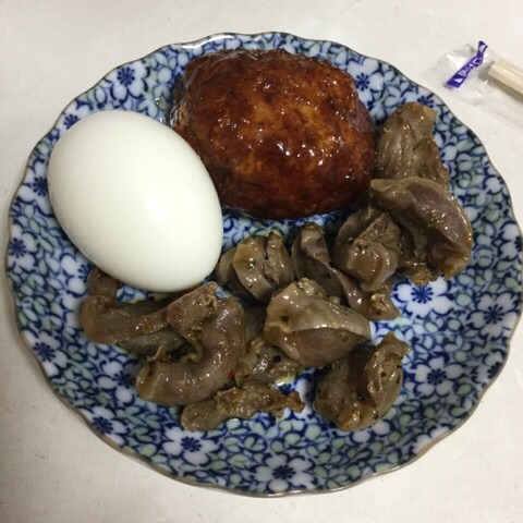 夕食:ゆで卵、卵入りつくね、砂肝のレモンペッパー
