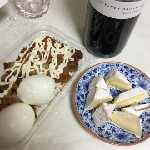 夕食:トンカツ、イカの唐揚げ、ゆでたまご、チーズ、ワイン