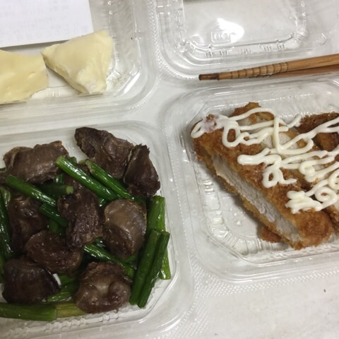 夕食:トンカツ、砂肝炒め、チーズ