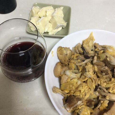 夕食:東海林風チャーシューとたまごとネギときのこの炒め物、ブリー・ド・モー、ワイン