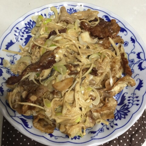 夕食:豚バラとネギときのこのオイマヨ炒め