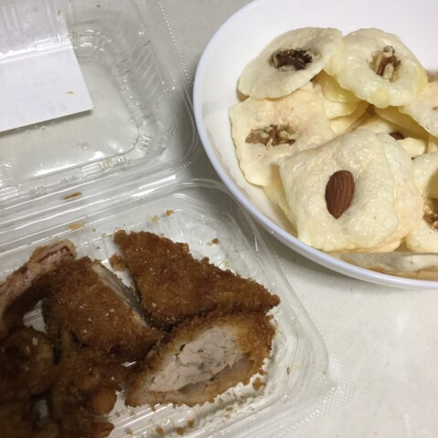 夕食:チーズせんべい(自作)、ヒレカツ(惣菜)