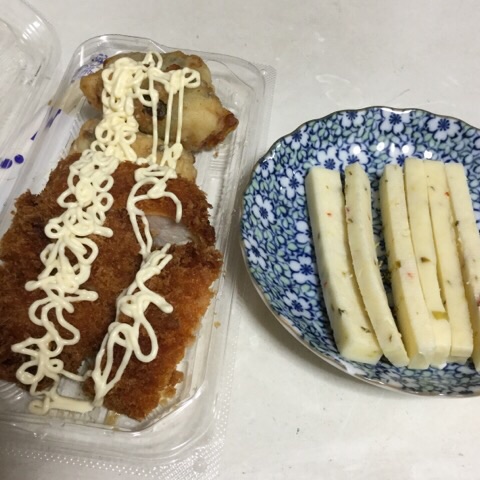 夕食:棒チキンカツ、チキンとチーズの竜田揚げ、チーズ(ペッパージャック)