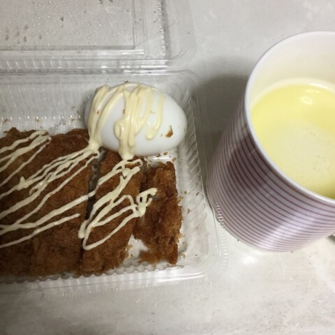 夕食:トンカツ、ゆでたまご、バターのお湯割り