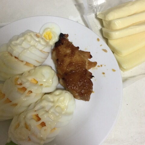 夕食:鶏肉の味噌漬け焼き(お惣菜)、ゆでたまご、チーズ
