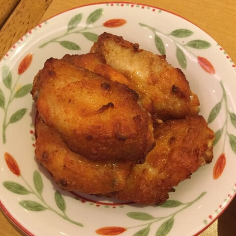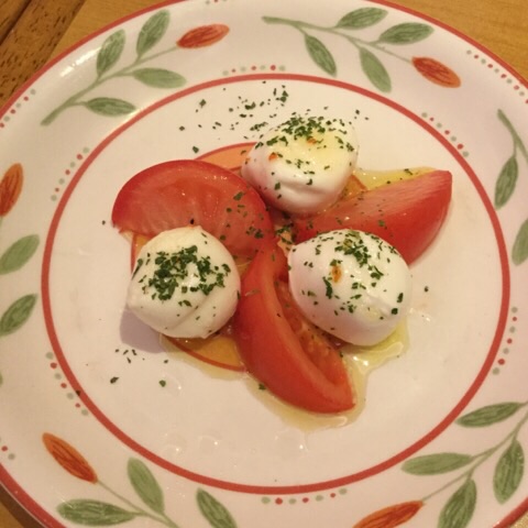 夕食:辛味チキン、モッツアレラとトマトのサラダ