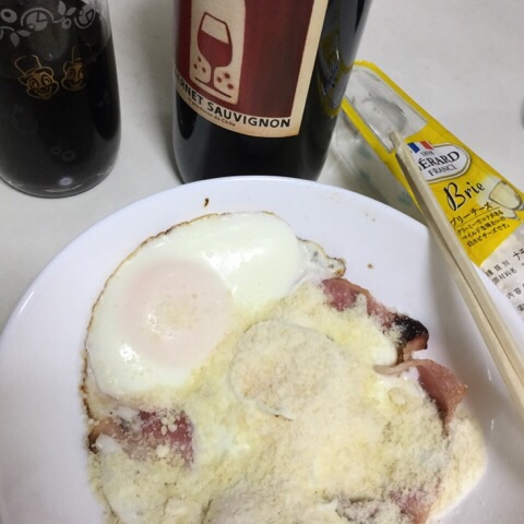 夕食:ベーコンエッグ粉チーズのっけ、ブリーチーズ