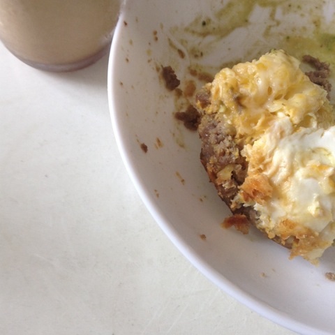 朝食:水出しコーヒー+生クリーム、ゆでたまご、焼肉ののこり