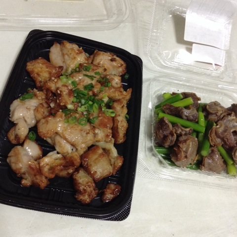 夕食:西友のネギ塩チキン、砂肝揚げとニンニクの芽