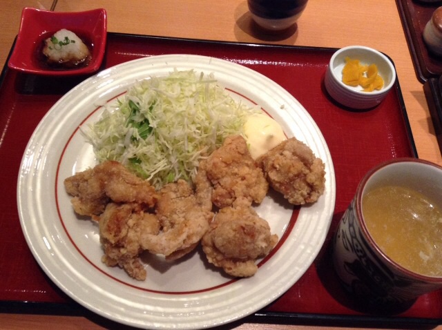 昼食:唐揚げ食べ放題定食 ごはん、ドレッシング抜き