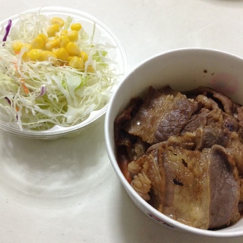 夕食:松屋の牛カルビダブル、野菜サラダ