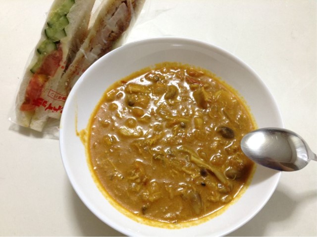朝食:3日目のカレー+サンドイッチ(野菜&カツ) 糖質50gくらい