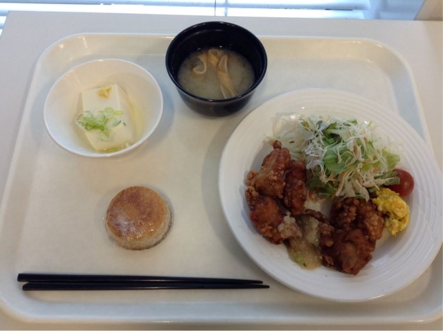 昼食:鶏の竜田揚げ定食+アーモンドケーキ 糖質20gくらい